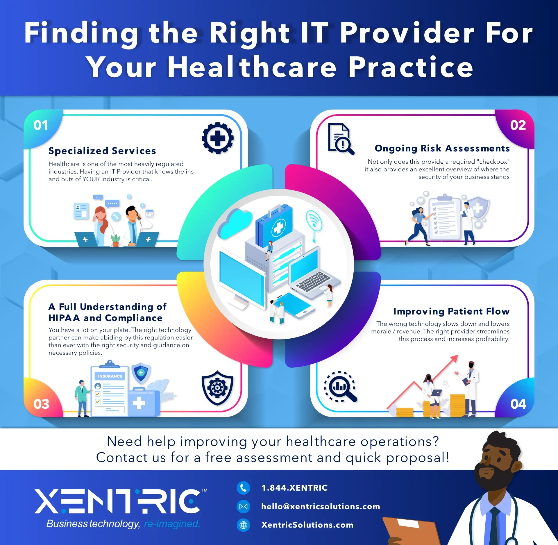 Xentric Solutions is the premier Healthcare IT Support company in Los Angeles County. Our team of IT professionals have experience with healthcare IT, and understand the unique technological challenges healthcare facilities face.